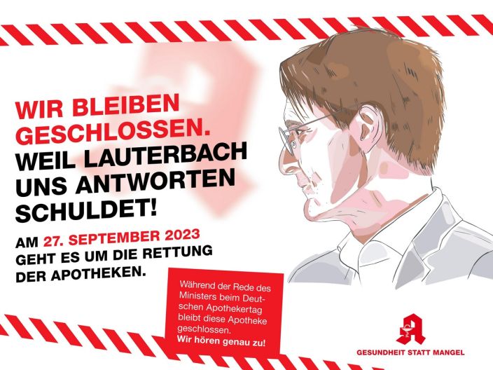 Wenn Karl Lauterbach am Mittwoch, 27. September, dem Deutschen Apothekertag digital zugeschaltet wird, verlangen wir Antworten! Denn trotz bundesweiter Proteste und viel Unterstützung aus der Bevölkerung unternimmt die Bundesregierung leider weiterhin nichts, um die Apotheken vor Ort zu stabilisieren. Apotheken kaputtsparen? Mit uns nicht!